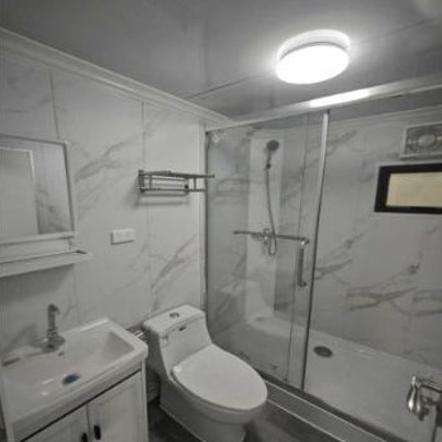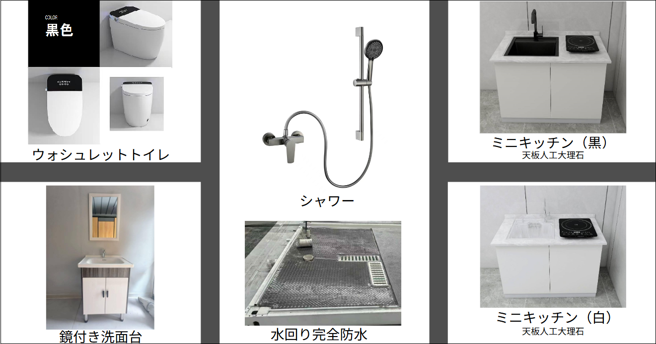 長期利用を想定し、住宅レベルの清潔なキッチン、トイレ、バスルームを完備しました。完全防水設計により清潔さを保ち、仮設の常識を超える「家」としての快適さを、最短期間で提供します。